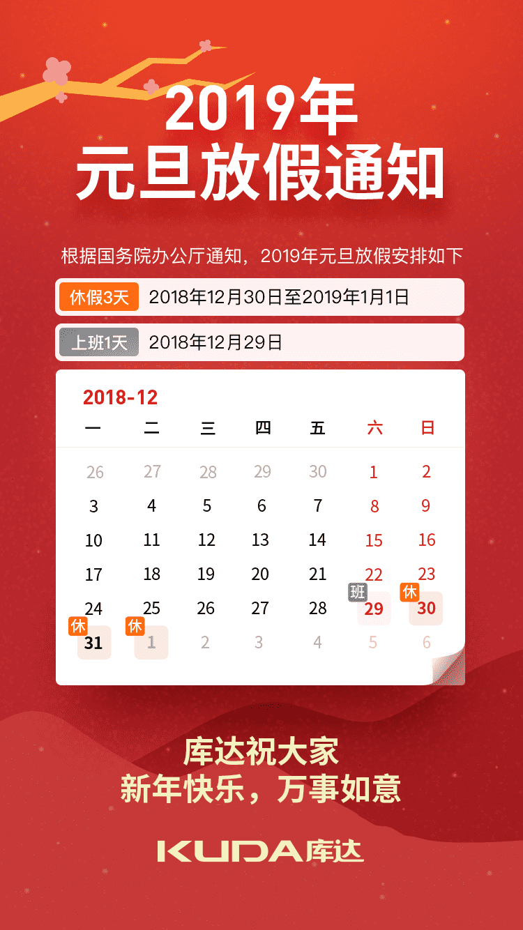休假3天:2018年12月30日至2019年1月1日  上班1天:2018年12月29日